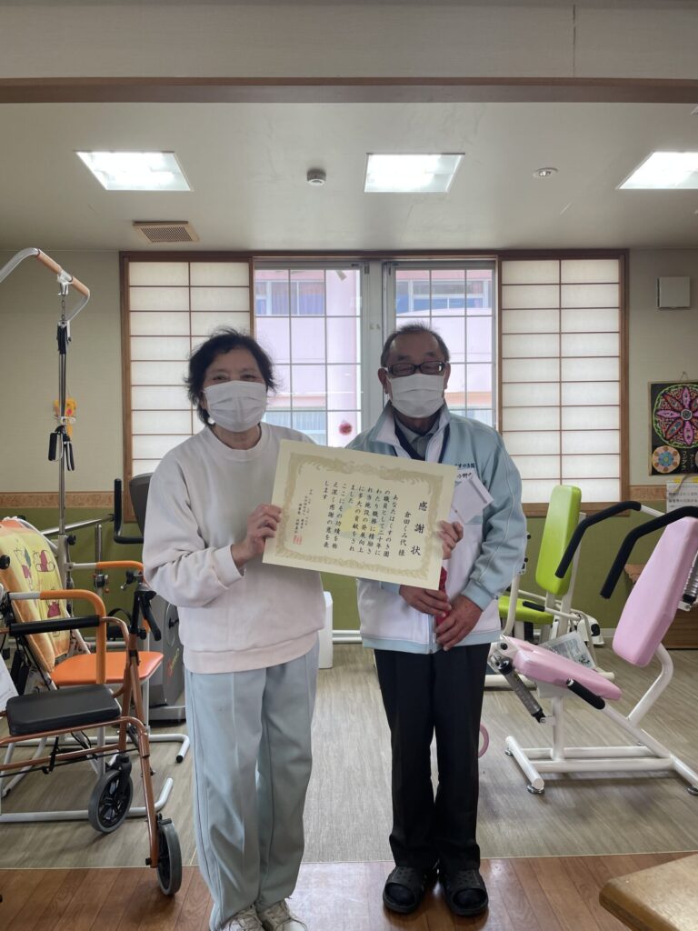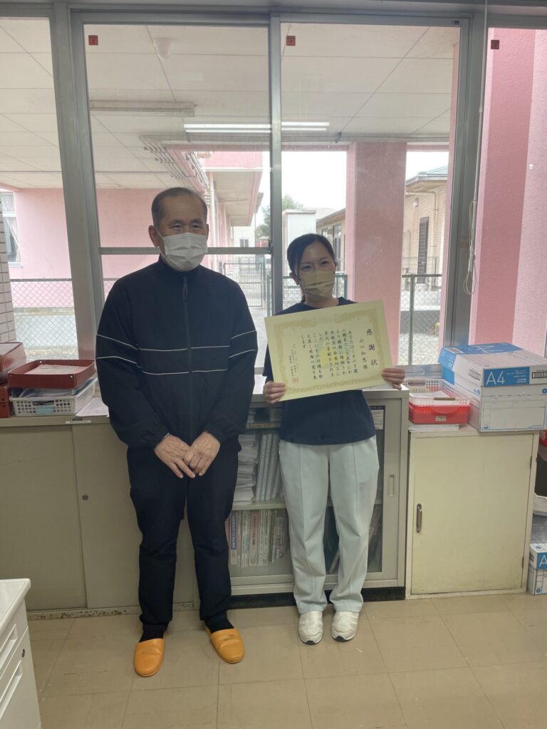 永年勤続表彰をさせていただきました。長年くすのき園でお仕事いただきありがとうございます。これからもよろしくお願いいたします。