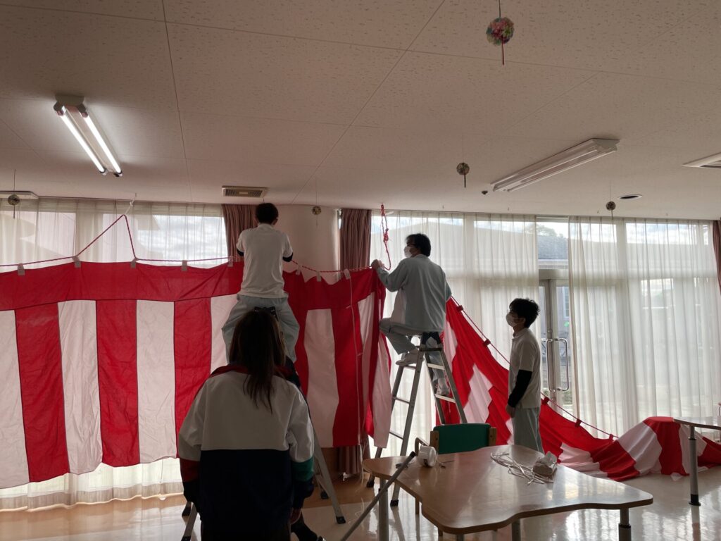 本日は餅つき大会でございます。会場の準備をさせていただいております。皆様のお越しを、心よりお待ちしております。