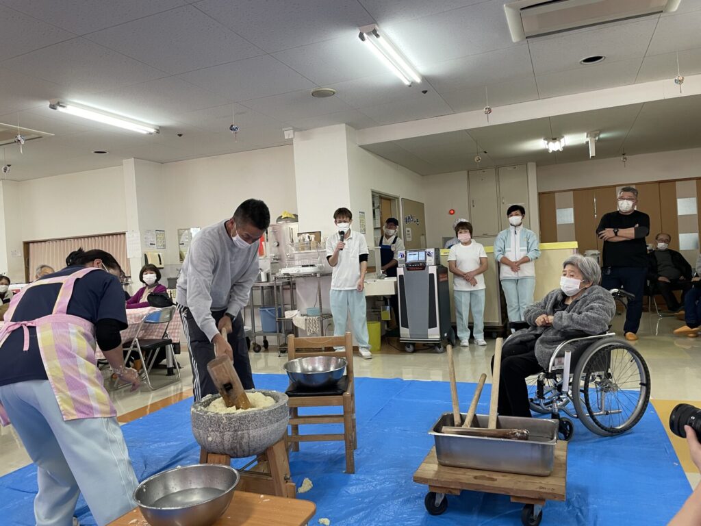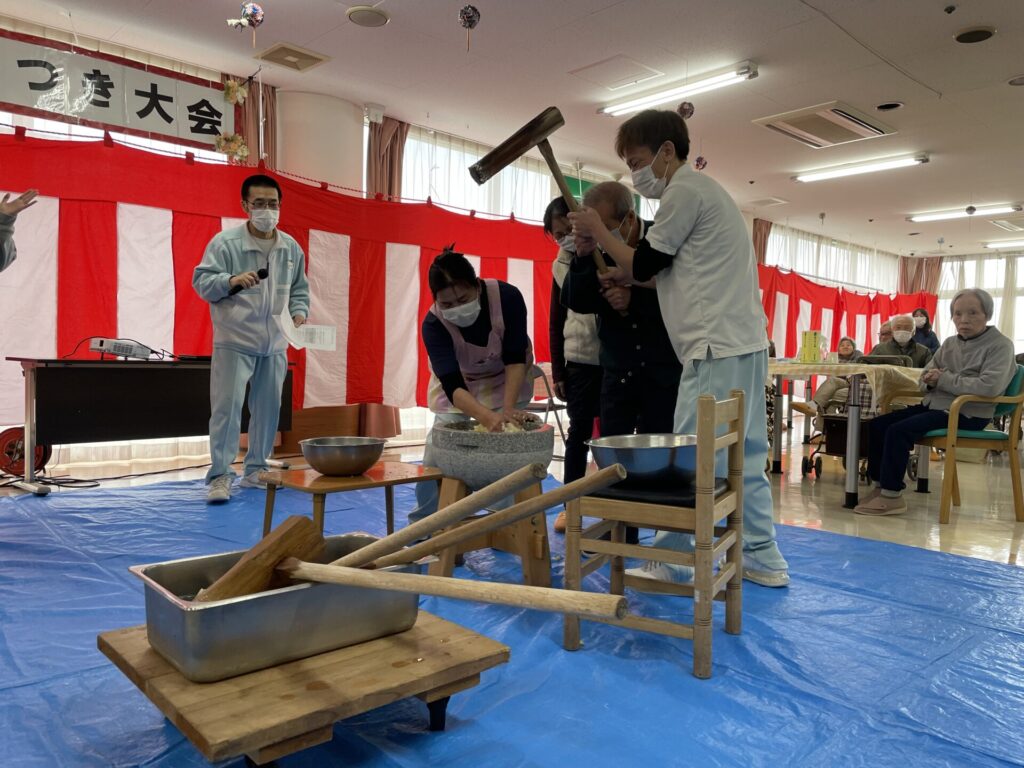 くすのき園恒例の餅つき大会を開催しました。当日は職員が協力し合いながら準備・運営を行い、入居者様・利用者様に季節の行事を楽しんでいただきました。